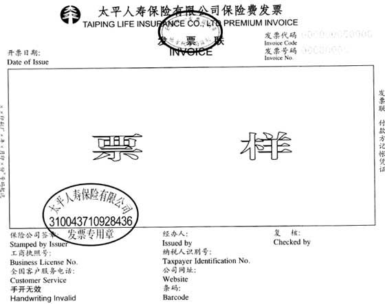 (三)保险费发票的印制内容包括:“太平人寿保险有限公司保险费发票”、“发票联”、“发票代码”、“发票号码”、“开票日期”、“保险公司签章”、“经办人”、“复核”、“工商执照号”、“纳税人识别号”、“全国客户服务电话”、“公司网址”、“手开无效”、“条码”。在“保险公司签章”位置套印太平人寿保险公司发票专用章,发票专用章左侧距保费打印区左边线15MM,“发票专用章”字体顶部与保费打印区底边线对齐。保险费发票印制内容标有英文对照。