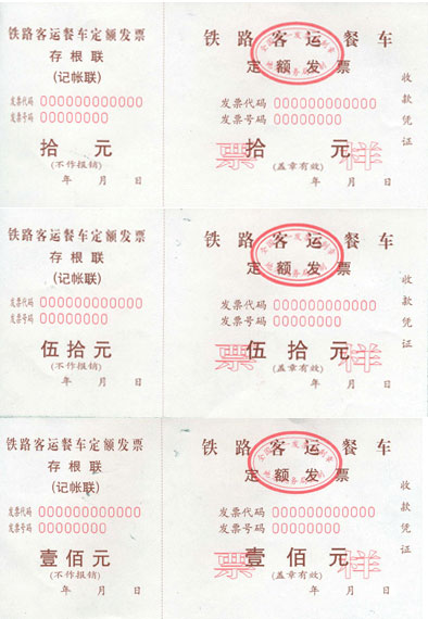 二、铁路餐车发票为单张两联式,即存根联和发票联平行设置,左侧为存根联,右侧为发票联。定额发票的面额为壹元、贰元、伍元、拾元、伍拾元和壹佰元 (发票式样附后)。