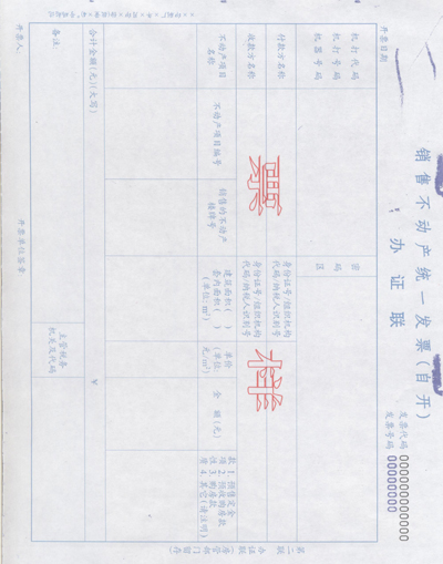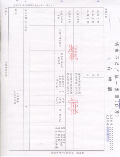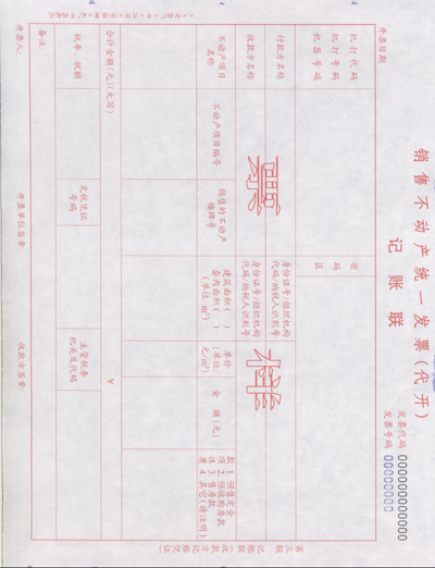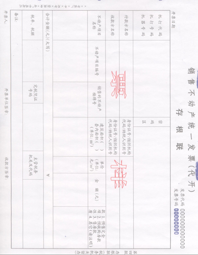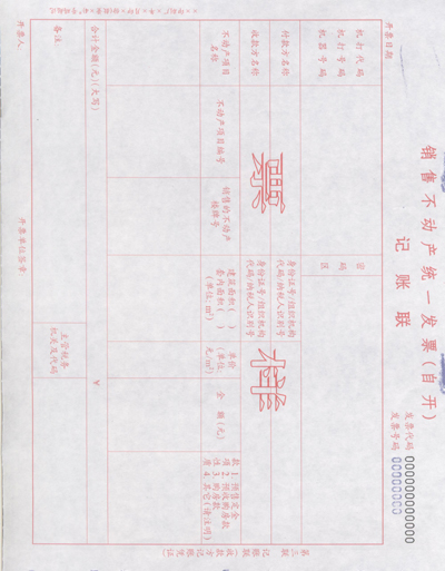 (二)《不动产发票》为电脑四联式发票。第一联发票联(付款方付款凭证),第二联办证联(房管部门留存),第三联记账联(收款方记账凭证),第四联存根联(收款方留存),不动产代开发票存根联由代开税务机关留存。第一联印色为棕色 ,第二联印色为蓝色,第三联印色为红色,第四联印色为黑色。发票代码、发票号码印色为黑色,《不动产发票》规格为241mm×177mm(票样附后)。