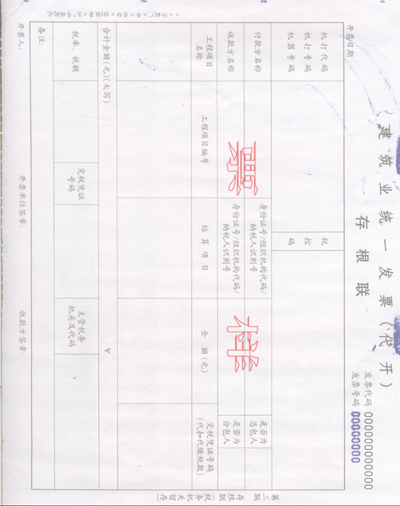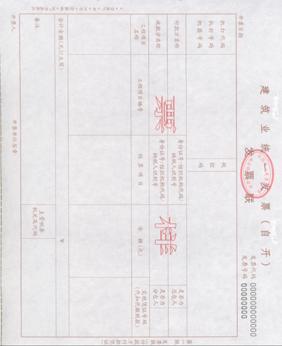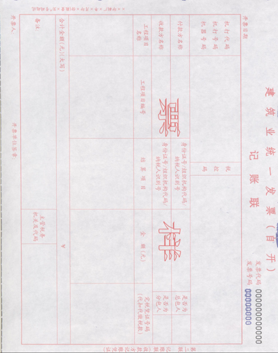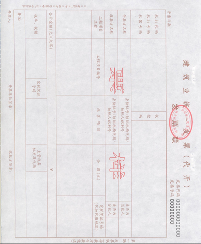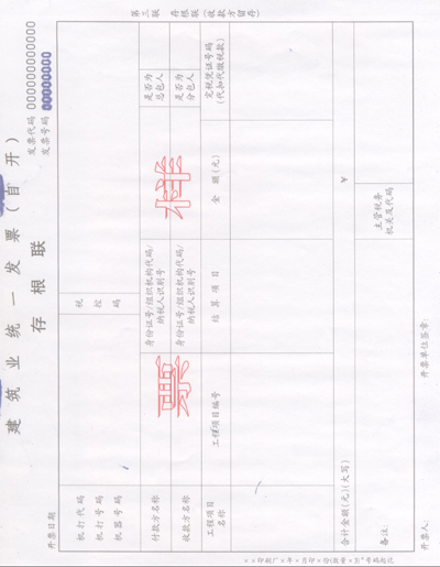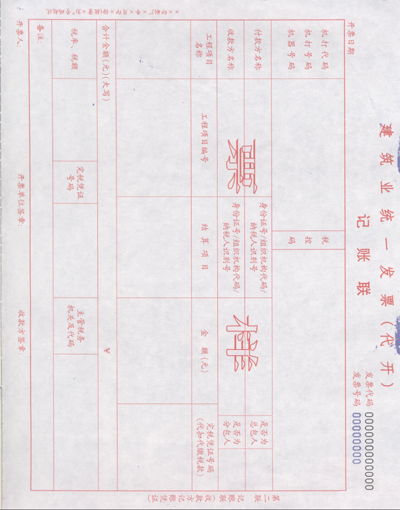 (二)《建筑业发票》为电脑三联式发票。第一联发票联(付款方付款凭证,印色为棕色),第二联记账联(收款方记账凭证,印色为红色),第三联存根联(收款方留存,印色为黑色);发票代码、发票号码印色为黑色;规格为241mm×177mm(票样附后)。建筑业代开发票存根联由代开税务机关留存。