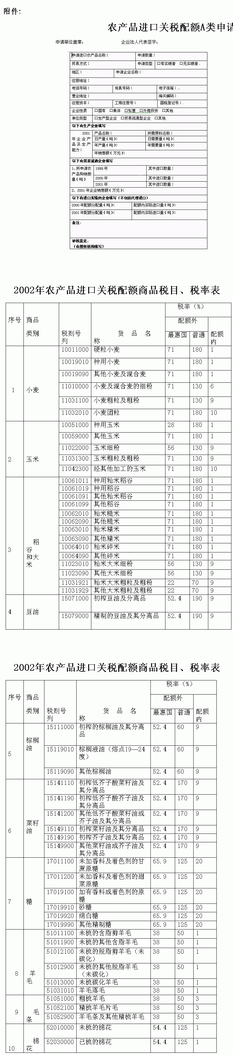 六、2002年农产品进口关税配额申请时间自公告发布之日起,2月21日截止。A类配额申请者需到国家计委授权机构领取(或在中经网下载、复印)并填写《农产品进口关税配额A类申请表》(见附件)。国家计委授权机构负责受理属地范围内的企业申请。
