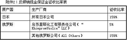 一、自2005年1月7日起,对原产于俄罗斯和日本的进口三氯乙烯(税则号列29032200),海关除按现行规定征收关税和进口环节增值税外,还将区别不同的供货厂商,按照反倾销现金保证金征收比率表(详见附件2)所列的征收比率征收反倾销现金保证金。