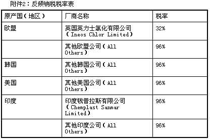 一、自2004年11月30日起,对申报进口原产于欧盟、韩国、美国、印度的三氯甲烷(税则号列:29031300),除按现行规定征收法定关税外,还应区别不同的供货厂商,按照本公告附件2所列的适用税率和下述公式征收反倾销税,并按下述公式计征进口环节增值税。