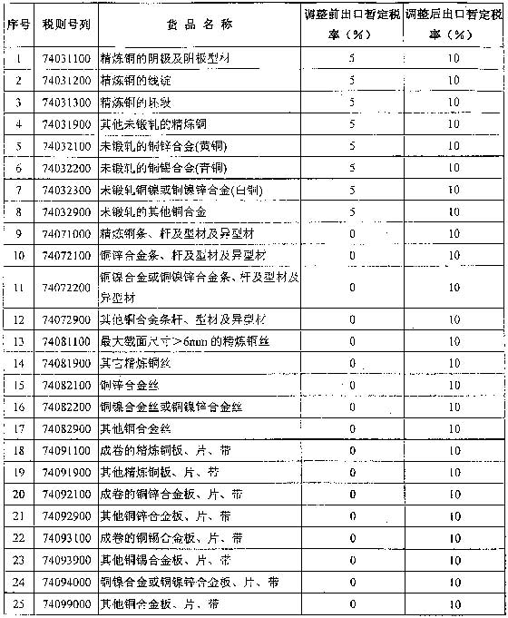 经国务院批准,自2006年4月10日起,将精炼铜及铜合金的出口暂定税率由5%调至10%,铜材的出口暂定税率由0%调至10%。具体调整情况见附件。