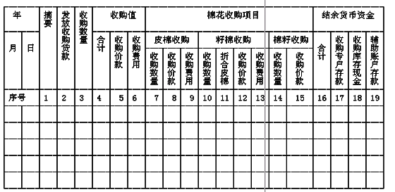 (六)棉花收购项目:根据当日收购码单或棉花收购解缴单按收购实际占用贷款区别于皮棉收购和籽棉收购记录棉花收购数量、收购价款和收购费用。皮棉收购价款和籽棉收购价款分别按皮棉收购价和籽棉收购价乘以收购量计算。籽棉折合皮棉按国家棉花收购有关标准折算后再登记。