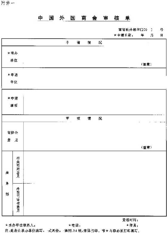一、自2006年5月1日起,凡需报商务部审核的中国外国商会和外国非企业经济组织常驻代表机构,请分别使用新的“中国外国商会审核单”和“外国非企业经济组织常驻代表机构审核单”(格式附后,可到商务部政府网站www.mofcom.gov.cn或中国国际电子商务网www.ec.com.cn下载),原格式核准单不再使用。