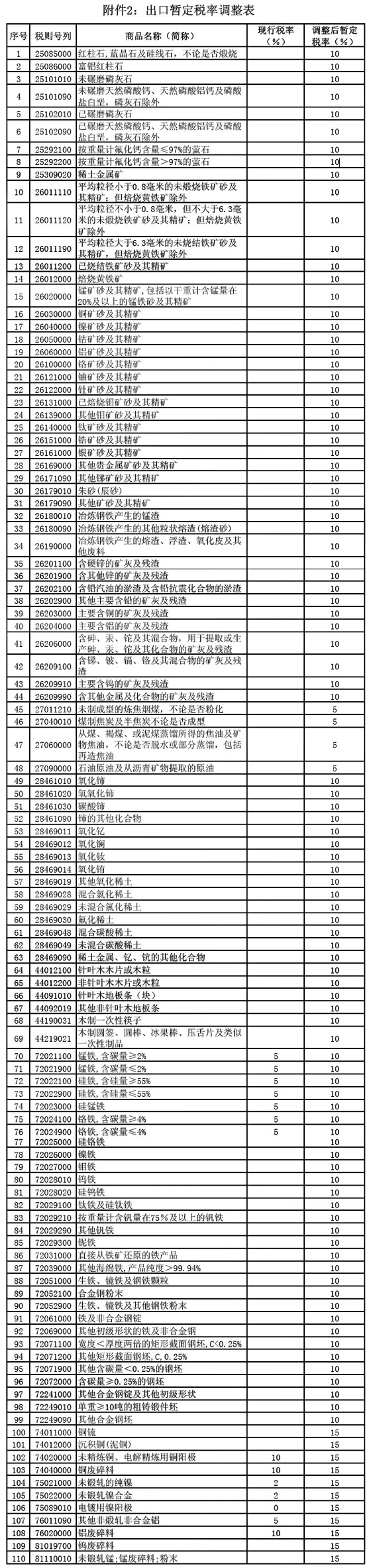 (一)对磷灰石、稀土金属矿、金属矿砂等44项矿产品实施10%的出口暂定税率;