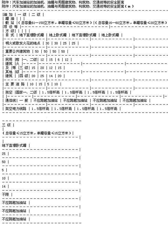 注:一、三级汽车加油站相邻的民用或其他建筑为一、二级耐火等级,且与加油站相邻一面无门窗时,其与加油站的安全距离可不限。
