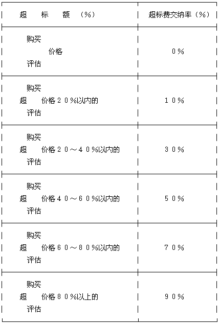 注:本表交纳超标费均按档计算。例:购买价格(评估价格)为2 万元,出售时为3.5万元,超标1.5万元,超标率为75%,按表 超了四档,第一档为20%,超4000元,计400元超标费;第二 档为20%,超4000元,计1200元超标费;第三档为20%,超 4000元,计2000元超标费;第四档为15%,超3000元,计 2100元超标费。共交纳超标费5700元。