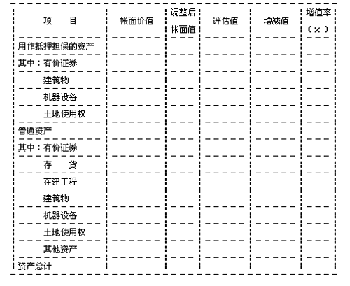 1.破产企业资产评估明细表的资产科目设置参照财政部下发的《国有企业试行破产有关会计处理问题的暂行规定》(财会字[1997]28号)中资产负债表的会计科目设置,评估结果汇总表格式参见附表。对因破产清算资产中不涉及抵押、担保事项,或是涉及抵押、担保事项的资产和金额较少,或是由于抵押权人、担保权人放弃优先受偿权的,明细表和汇总表格式可仍按91号文件规定的格式出具。
