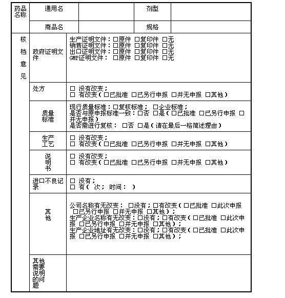 (此表为进口药品再注册申请核档专用,请在要选择项前打“√”)