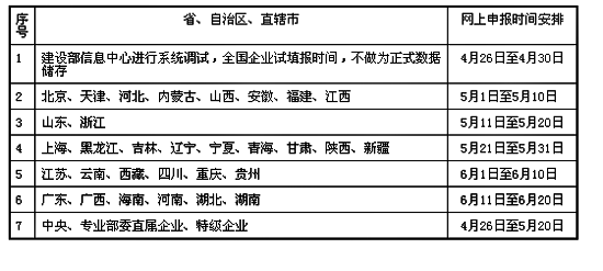 注:1、按各省、自治区、直辖市建筑业企业直接通过建设部信息中心上网申报的企业数进行时间安排。