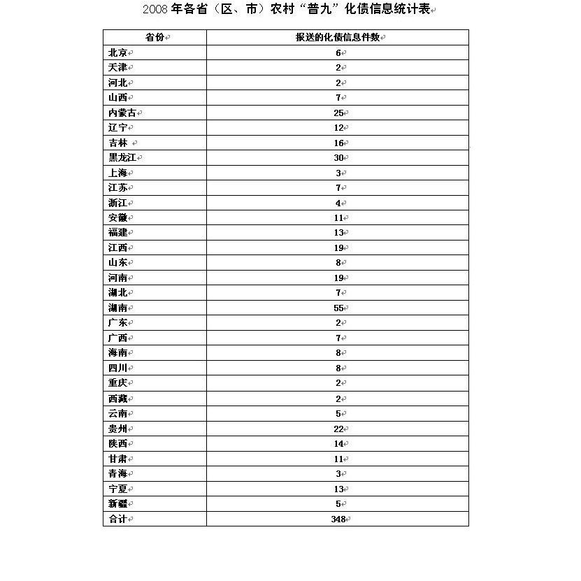化债信息联络员制度和月报制度实施以来,各省(区、市)财政厅、综改办及有关部门高度重视,按照要求报送化债信息,客观、及时、准确地反映了地方化债试点工作的基本情况、存在的问题和解决办法,为领导决策提供了大量第一手资料和相关政策建议。截至2008年12月底,各省(区、市)向工作小组办公室上报农村“普九”化债信息共348件(具体情况见附表),其中,化债案例材料31件。首批14个试点省份报送化债信息共251件,占全部信息的72%,其中湖南55件、黑龙江30件、内蒙古25件、贵州22件、江西19件、吉林16件、陕西14件、宁夏13件、福建13件、安徽11件、甘肃11件、四川8件、湖北7件、江苏7件。非试点省份报送化债信息共97件,其中报送较多的省份分别是河南19件、辽宁12件、山东8件、海南8件。