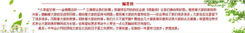 2008年终于为自己长达七年的CPA考试生涯划上了一个圆满的句号。七年了,锲而不舍,点滴在心,每一次都在徘徊孤单中坚强,每一次就算很受伤也不闪泪光……全文