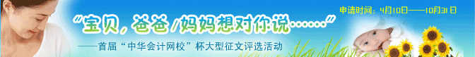 “宝贝,爸爸/妈妈想对你说……”大型征文活动是正保会计网校面向网校所有爸爸/妈妈级考生开展的一项有奖评选活动,将以阶段性评选的方式进行。本活动旨在深度挖掘爸爸妈妈们在学习与生活中和自己的亲亲小宝贝发生的有趣或感人的亲情故事,回忆考试过程中与宝贝的点点滴滴,或是牵挂、或是心酸、抑或是感动……种种苦辣酸甜都是美好的记忆。在这里记录下宝宝的成长与自己的进步,让我们共同的的梦想与愿望在网校茁壮成长,硕果累累。希望本活动能够给您的亲亲小宝贝带去一份特别的温馨与祝福,预祝每位"会计小宝贝"们健康成长,预祝每位会计人梦想成真!查看活动详细>>>