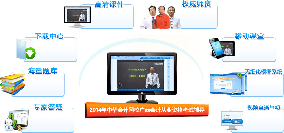 权威的师资阵容:会计辅导权威专家执教,丰富的教学经验,对考试重点、难点把握准确! 考试、练习中心:课后同步练习,海量题库附有答案及解题思路与分析。考前高含金量模拟题,让学员体验实战演练。