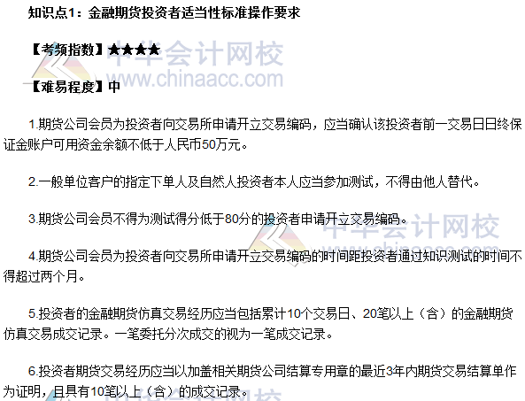 2016年第五次期货从业考试时间为11月19日。为了帮助参加2016年期货从业资格考试的学员巩固知识,提高备考效果,正保会计网校精心为大家整理了期货从业资格考试《期货法律法规》法条二十二“金融期货投资者适当性制度操作指引”相关高频考点供大家学习,希望对广大考生有所帮助,祝大家学习愉快,梦想成真!