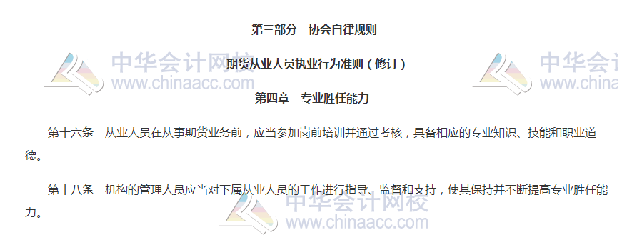 为帮助大家备考,正保会计网校整理了《期货法律法规》第三部分协会自律规则“期货从业人员执业行为准则”的知识点,祝大家学习愉快!