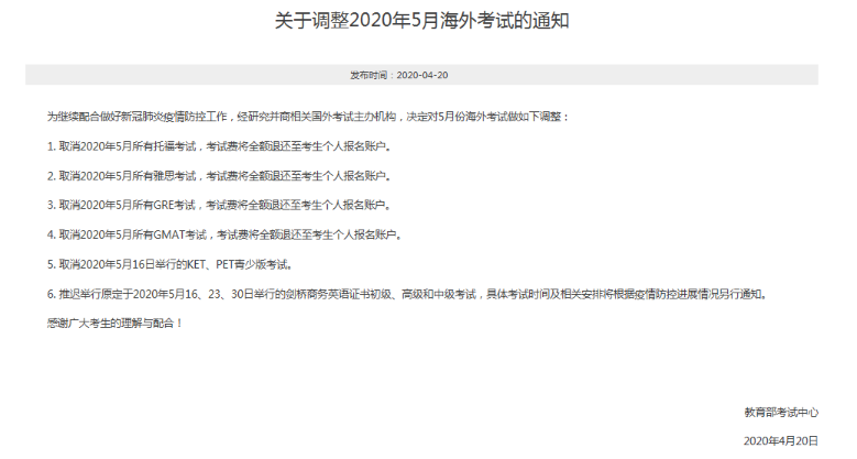 大家可以看一下,以上图片就是海外考试取消的通知,大家可以来了解一下哦~
