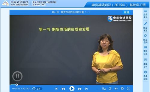 正保会计网校2015年期货从业资格考试辅导招生工作全面启动!为了帮助广大考生提前做好备考准备,打好基础,快速进入高效备考状态,抢先开通基础学习班课程。网校2015年基础学习班课程对考试教材进行全面系统讲解,对各章节中的知识点反复讲解并举一反三,进一步深化解析,让学员夯实基础,为新一期备考做好充分准备。以下是网校老师刘荔2015年期货从业资格考试《期货基础知识》基础学习班高清视频课程: