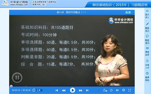 正保会计网校2015年期货从业资格考试辅导招生工作全面启动!为了帮助广大考生快速进入高效备考状态,抢先开通习题精讲班课程。网校2015年习题精讲班通过精选大量极具代表性的习题,深入剖析解题思路,演示解题过程,提炼解题技巧,指导学员熟悉考试题型、掌握命题规律、提高解题能力。以下是网校老师刘荔2015年期货从业资格考试《期货基础知识》基础学习班高清视频课程: