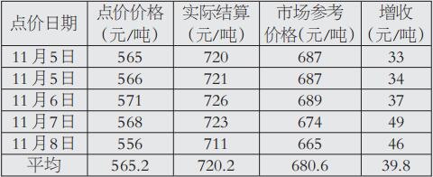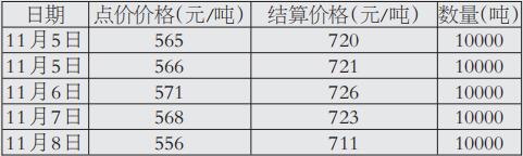 淡水河谷自2019年11月5日—11月8日,共完成5次点价,点价总量为5万吨,货物于10月28日完成交割。点价时对应的盘面价格自556元/吨到571元/吨不等,BRBF粉最终售价自711元/湿吨到720元/吨不等。具体细节见下表:
