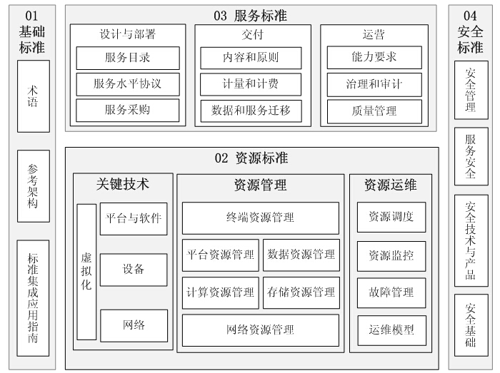 3.云服务标准。用于规范云服务设计、部署、交付、运营和采购,以及云平台间的数据迁移。主要包括服务采购、服务质量、服务计量和计费、服务能力评价等方面的标准。