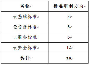 以云计算综合标准化体系框架为基础,通过研究分析信息技术和通信领域已有标准,提出现有标准缺失的,并能直接反映云计算特征,有效解决应用和数据迁移、服务质量保证、供应商绑定、信息安全和隐私保护等问题的29个标准研制方向(如表1,详见附件2),以指导具体标准的立项和制定。对尚未纳入标准研制方向但在云计算综合标准化体系框架中列出的,统一作为标准化需求研究方向。