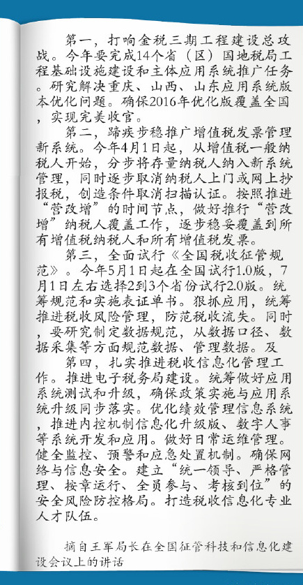 ①优化完善金税三期工程应用软件,完成14个省(区)国地税局工程基础设施建设和主体应用系统推广;②蹄疾步稳推广增值税发票管理新系统,抓好新系统推广后的应用;③全面试行《全国税收征管规范》,7月1日左右选择2-3个省试行2.0版;④扎实推进税收信息化管理工作。