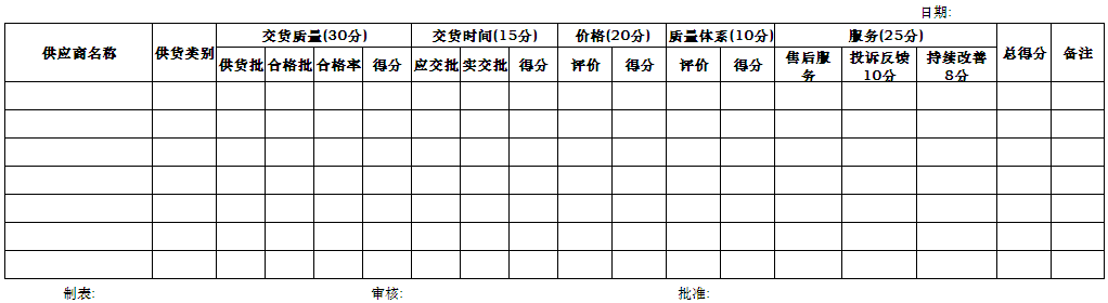公司制定合格供应商评估标准,明确各评估部门职责以及评估项目;供应商管理部门联合生产、技术、计划、财务、人事、物流、市场等部门开展供应商定期评估;合格供应商定期评估可以从以下维度开展:质量、交货、成本、创新、服务或支持。