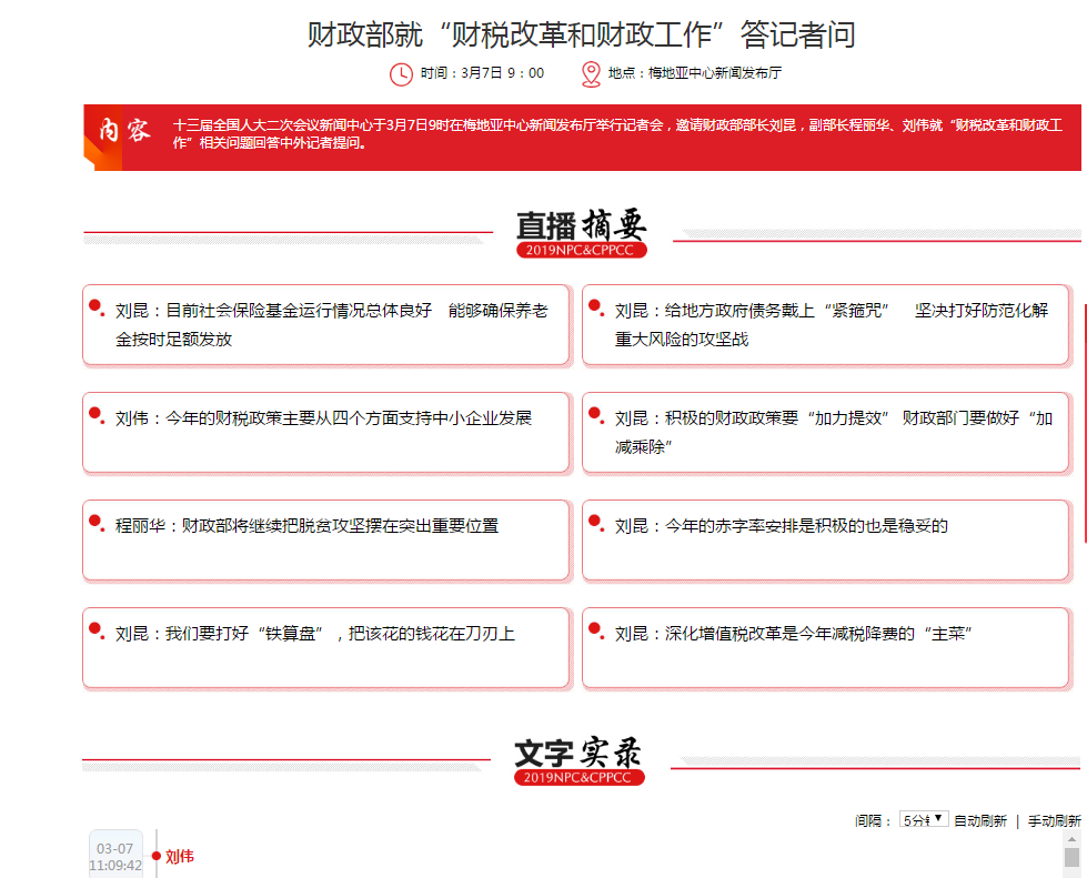 十三届全国人大二次会议新闻中心于3月7日9时在梅地亚中心新闻发布厅举行记者会,邀请财政部部长刘昆,副部长程丽华、刘伟就“财税改革和财政工作”相关问题回答中外记者提问。