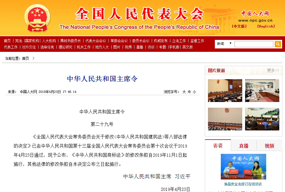《中华人民共和国商标法》的修改条款自2019年11月1日起施行,其他法律的修改条款自本决定公布之日起施行。
