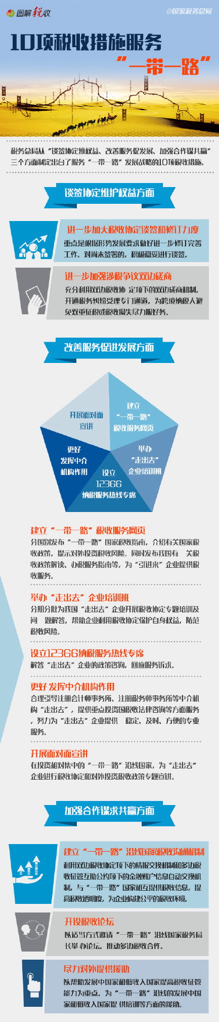 近日,税务总局召开新闻通报会表示,将从“谈签协定维权益、改善服务促发展、加强合作谋共赢”三个方面制定出台了服务“一带一路”发展战略的10项税收措施。具体都包括啥?一图了解。