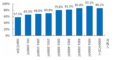 对于不同收入的居民来说,对自己收入状况满意和基本满意的合计比重基本上随收入水平增长逐渐提高,其中月收入500元以下满意和基本满意的合计比重只有57.3%,而月收入5001-6000元的居民合计比重为93.1%。但超过6000元后,居民满意和基本满意的合计比重却下降到86.1%。
