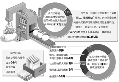 4月29日,国家税务总局同时公布了2014年度全国纳税信用A级纳税人名单和2015年一季度税收违法“黑名单”。其中,A级纳税人可以享受多项税收待遇和服务,而“黑名单”上的失信纳税人将受联合惩戒,真正实现“让守信者一路畅通,让失信者寸步难行”。
