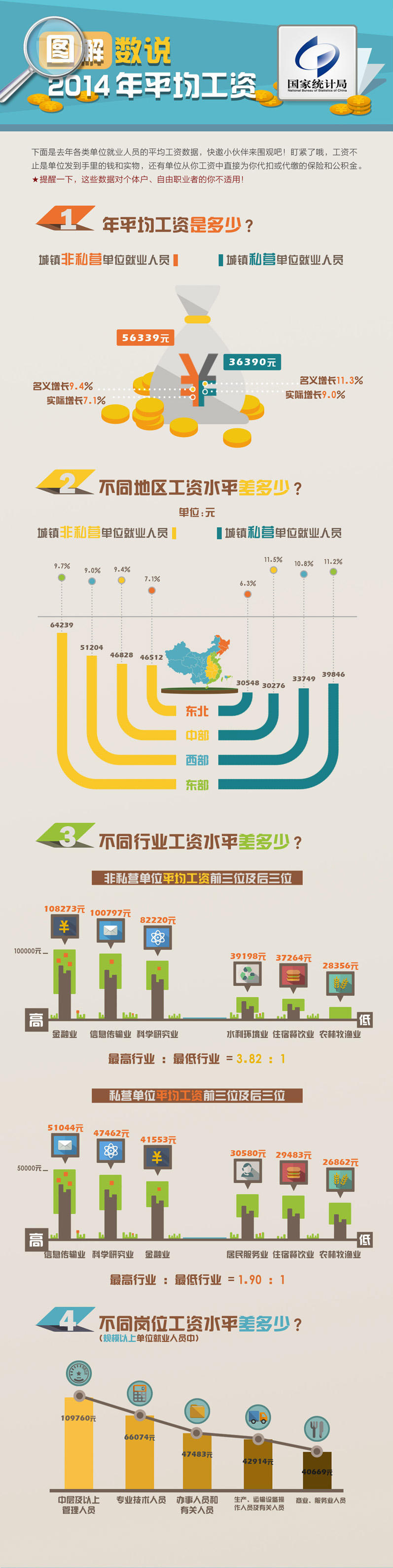 2014年,国家统计局通过一套表联网直报平台继续对不同岗位工资情况进行调查,涉及16个行业门类的91万多家企业法人单位。调查单位就业人员按工作岗位分为中层及以上管理人员,专业技术人员,办事人员和有关人员,商业、服务业人员,生产、运输设备操作人员及有关人员5类。