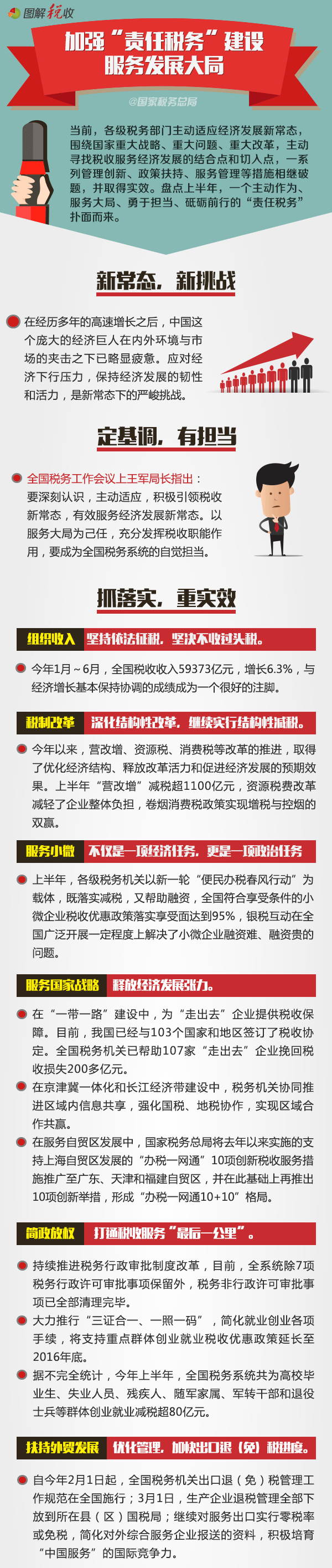 当前,各级税务部门主动适应经济发展新常态,围绕国家重大战略、重大问题、重大改革,主动寻找税收服务经济发展的结合点和切入点,一系列管理创新、政策扶持、服务管理等措施相继破题,并取得实效。盘点上半年,一个主动作为、服务大局、勇于担当、砥砺前行的“责任税务”扑面而来。