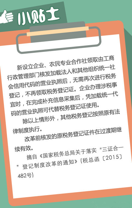 税务总局日前发布通知明确,2015年10月1日起“三证合一、一照一码”登记制度改革在全国推行,新设立企业、农民专业合作社领取由工商行政管理部门核发加载法人和其他组织统一社会信用代码的营业执照后,无需再次进行税务登记,不再领取税务登记证。