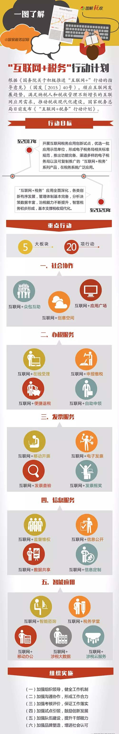 根据《国务院关于积极推进“互联网+”行动的指导意见》(国发[2015]40号),顺应互联网发展趋势,满足纳税人和税收管理不断增长的互联网应用需求,推动税收现代化建设,国家税务总局日前发布《“互联网+税务”行动计划》。