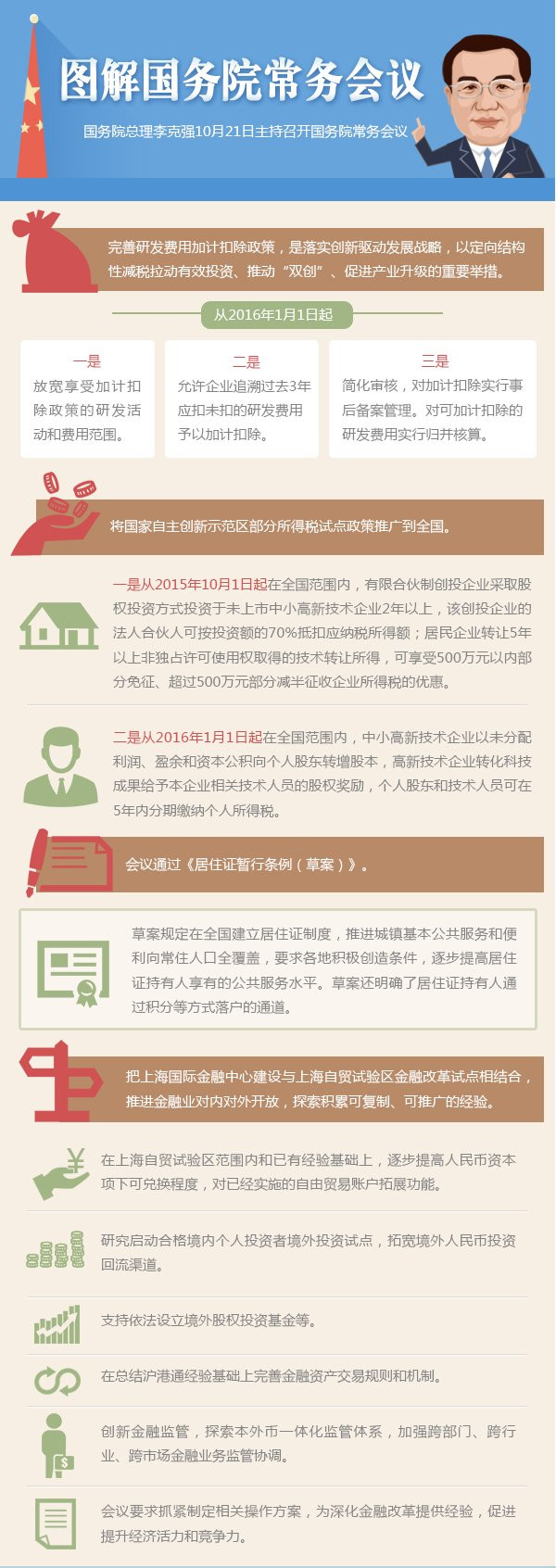 国务院总理李克强10月21日主持召开国务院常务会议,确定完善研发费用加计扣除政策,推动企业加大研发力度,决定在全国推广国家自主创新示范区部分所得税试点政策,推进结构调整,助力创业创新;通过《居住证暂行条例(草案)》,以法治助推新型城镇化;部署进一步深化上海自贸试验区金融改革试点,为服务实体经济积累经验。