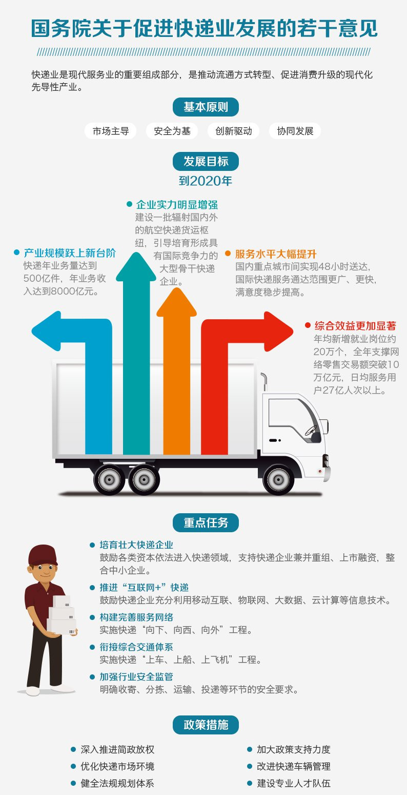 意见还提出了培育壮大快递企业、推进“互联网+”快递、构建完善服务网络、衔接综合交通体系、加强行业安全监管等重点任务,提出到2020年,基本建成普惠城乡、技术先进、服务优质、安全高效、绿色节能的快递服务体系,形成覆盖全国、联通国际的服务网络。