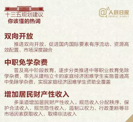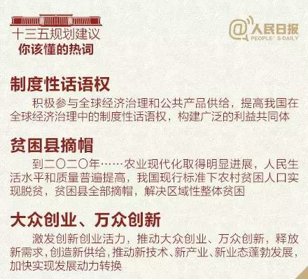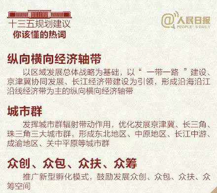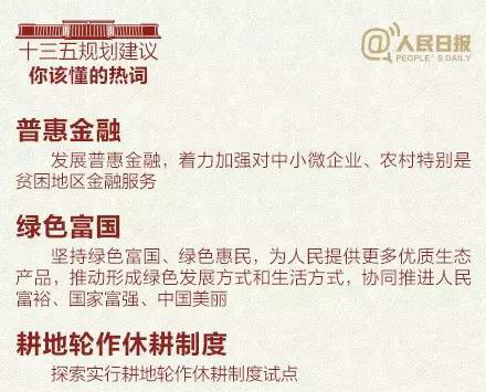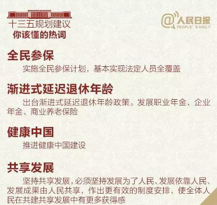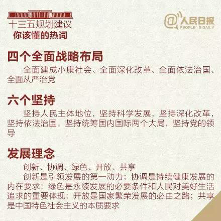 ①发展理念:创新、协调、绿色、开放、共享;②贫困县摘帽:到2020年现行标准下农村贫困人口实现脱贫;③渐进式延迟退休年龄:出台渐进式延迟退休年龄政策…四个全面、六个坚持是什么?众创、众包、众扶,是什么意思?规划建议中的新词热词,戳图学习↓