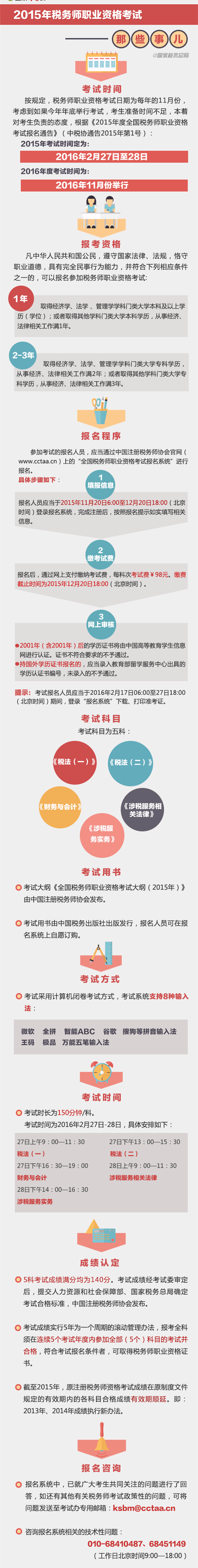 《2015年度全国税务师职业资格考试报名通告》明确,11月20日,2015年度全国税务师职业资格考试开始接受考生报名,考生可通过中国注册税务师协会官网登陆报名系统(http://ksbm.ecctaa.com/)报名,报名成功后于2016年2月27日—28日参加考试。一张图告诉你报考的相关事项,备考的小伙伴们要收藏哦!