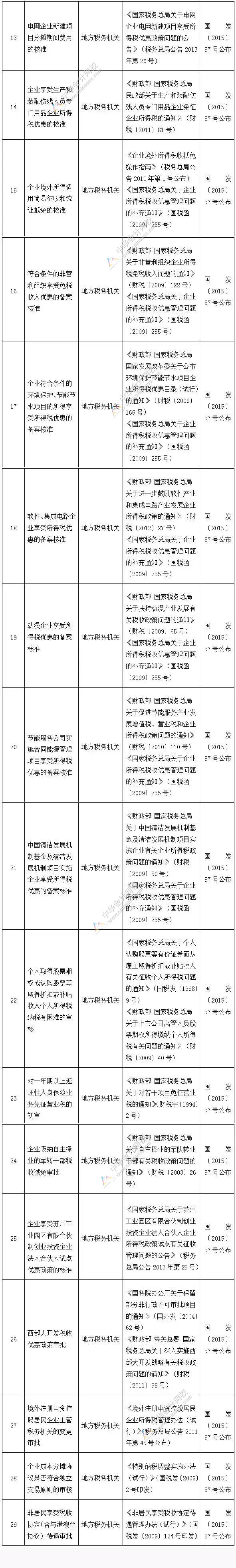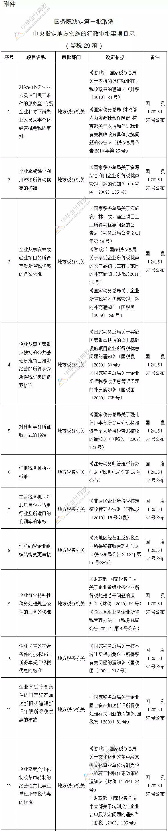《国务院关于第一批取消62项中央指定地方实施行政审批事项的决定》(国发〔2015〕57号)公布取消62项中央指定地方实施的行政审批事项。其中,涉及取消29项中央指定地方税务机关实施的税务行政审批事项。