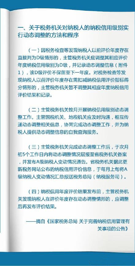 税务总局近日印发公告,明确主管税务机关按月开展纳税信用级别动态调整。发现纳税人以前评价年度存在直接判为D级情形的,调整其相应评价年度纳税信用级别为D级,该D级评价不保留至下一年度。完成动态调整后于次月初5个工作日内层报至省税务机关备案。
