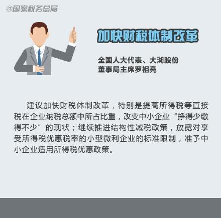 ②全国人大代表罗祖亮:加快财税体制改革,提高直接税在企业纳税总额中所占比重;