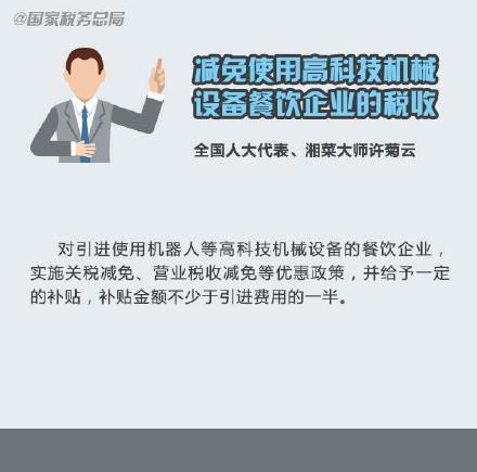 ③全国人大代表、湘菜大师许菊云:减免使用高科技机械设备餐饮企业的税收。