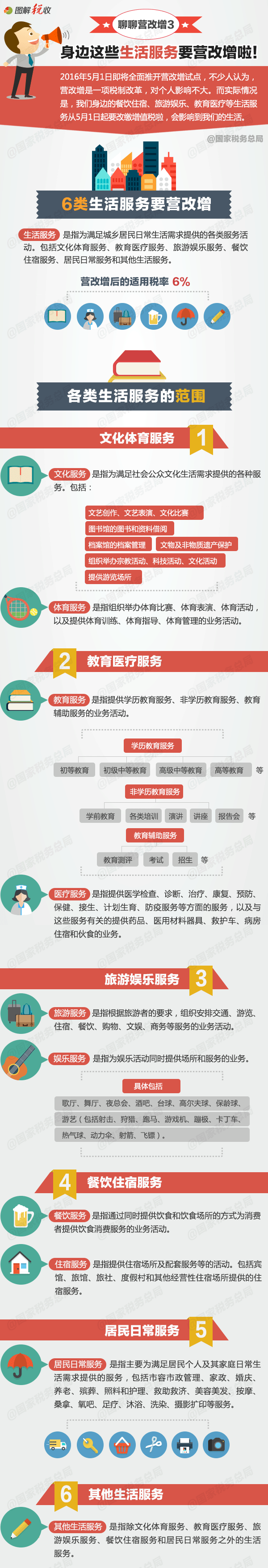2016年5月1日即将全面推开营改增试点,不少人认为,营改增是一项税制改革,对个人影响不大。而实际情况是,我们身边的餐饮住宿、旅游娱乐、教育医疗等生活服务从5月1日起要改缴增值税啦,会影响到我们的生活哦。