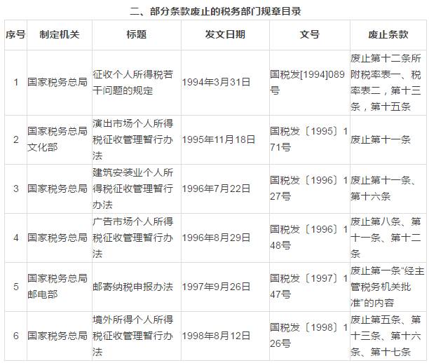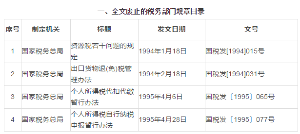 国家税务总局发布《关于公布全文废止和部分条款废止的税务部门规章目录的决定》(国家税务总局令第40号),全文废止4个税务部门规章,部分废止6个税务部门规章。