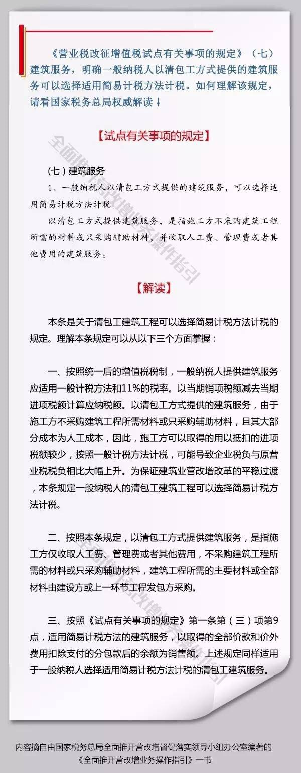 营业税改征增值税试点有关事项的规定》(七)建筑服务,明确一般纳税人以清包工方式提供的建筑服务可以选择适用简易计税方法计税。如何理解该规定,请看国家税务总局权威解读↓